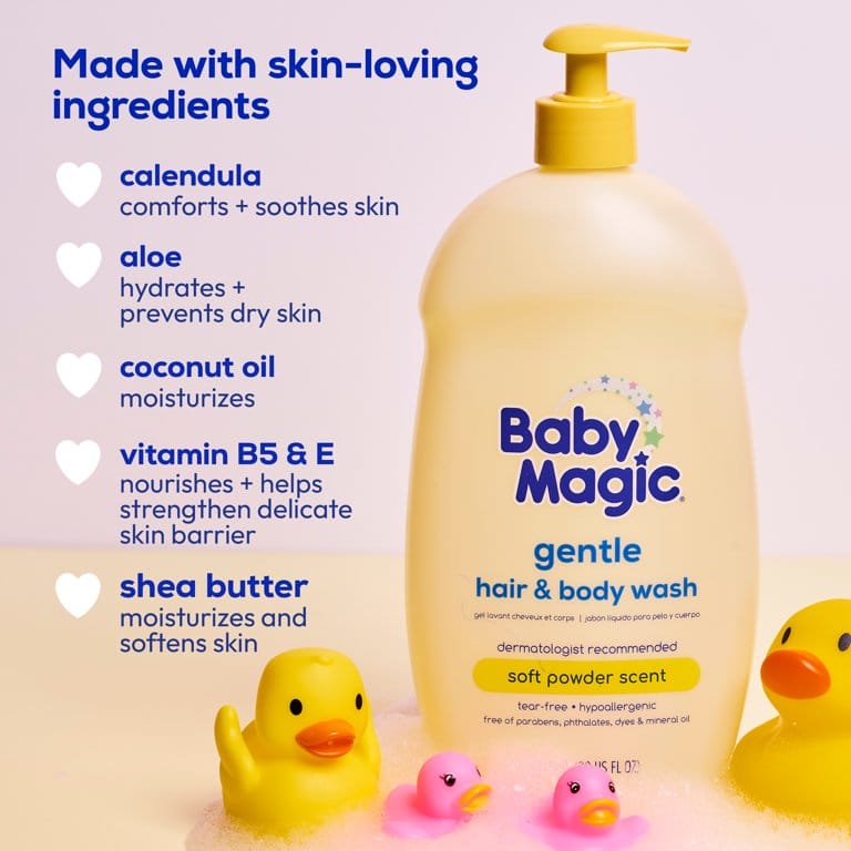 Nothing is sweeter than babies’ soft cuddles. Baby Magic Gentle Hair and Body Wash helps replenish moisture and maintain cuddly, soft skin. This gentle baby bath wash is formulated for daily care for dry to sensitive skin. With naturally skin-loving ingredients, this hydrating and tear-free baby bath wash formula cleans baby from top to bottom.