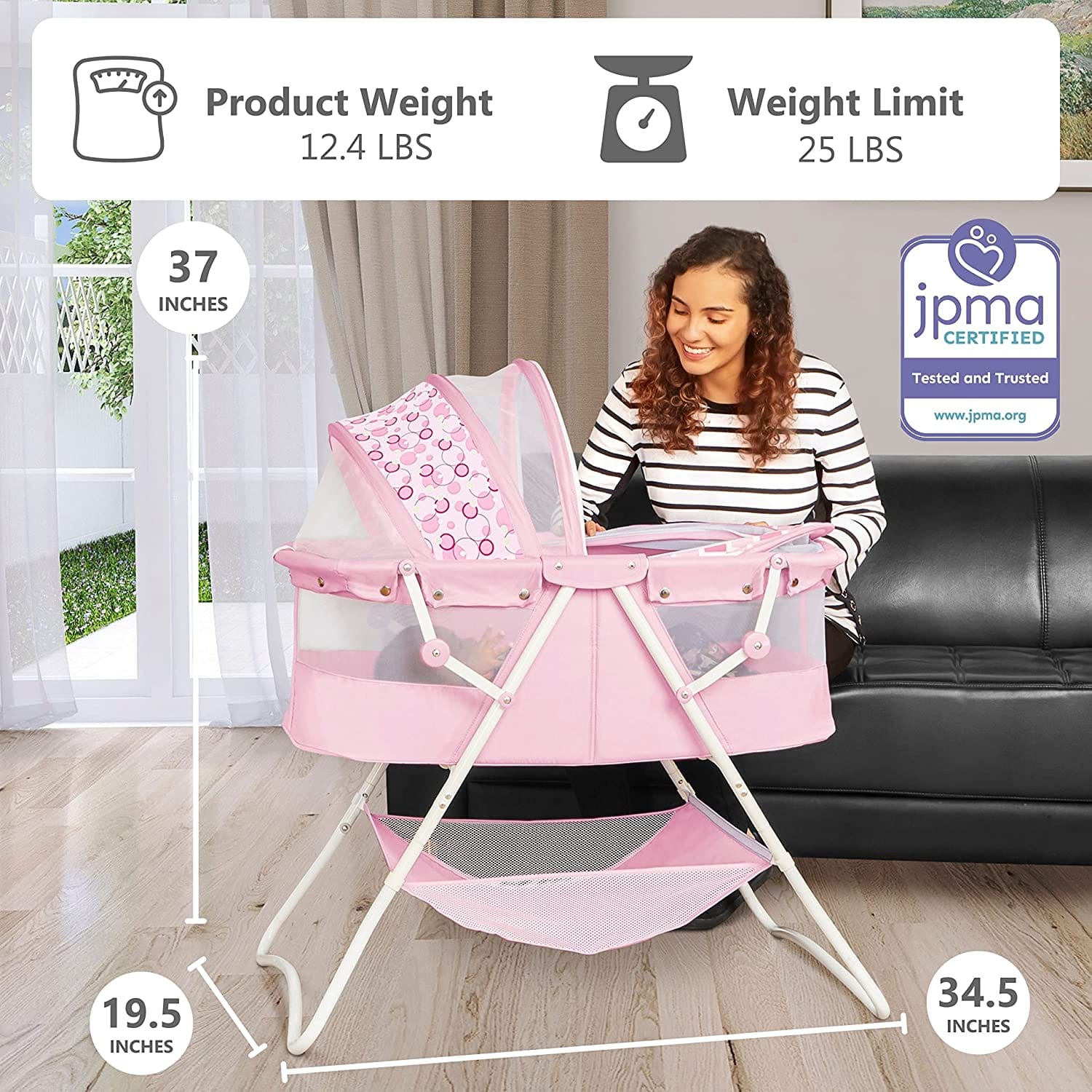 Built with a lightweight aluminum frame, the Karley Bassinet weighs just 12.4 lbs, making it incredibly easy to move from room to room. Its no-tool assembly and quick-folding mechanism allow for effortless setup, storage, and transport—perfect for indoor use or taking outdoors when needed. When folded, the bassinet stands upright for convenient storage.