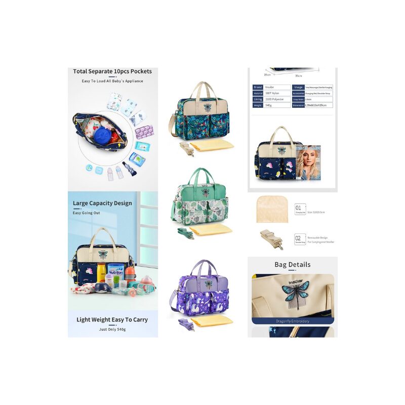 Inside, the bag offers ample space to carry all your essentials, including diapers and feeding items, while keeping everything tidy and easy to find. Its compact yet roomy size (approximately 15″ L x 7″ W x 13″ H) makes it ideal for daily outings without feeling bulky.
