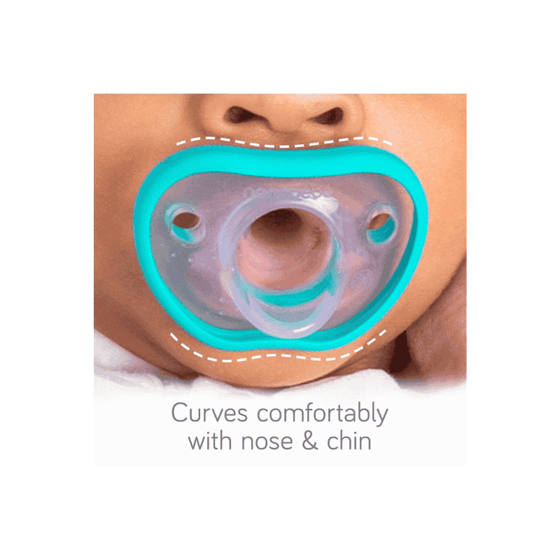 Nanobebe Baby Pacifier 0–3 months features ultra-soft 100% silicone, an ergonomic face-hugging design, and orthodontic nipple ideal for breastfed newborns.
