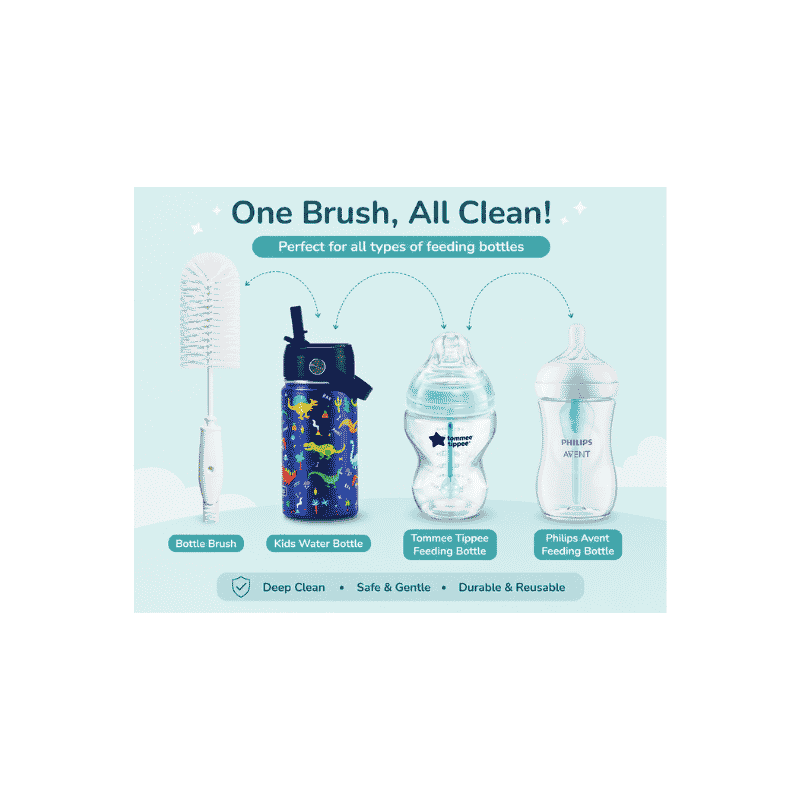 The ergonomic handle provides a comfortable grip, making washing easier and more controlled, even during busy routines. Whether you’re cleaning standard bottles, wide-neck bottles, or training cups, this brush is versatile enough to handle them all.