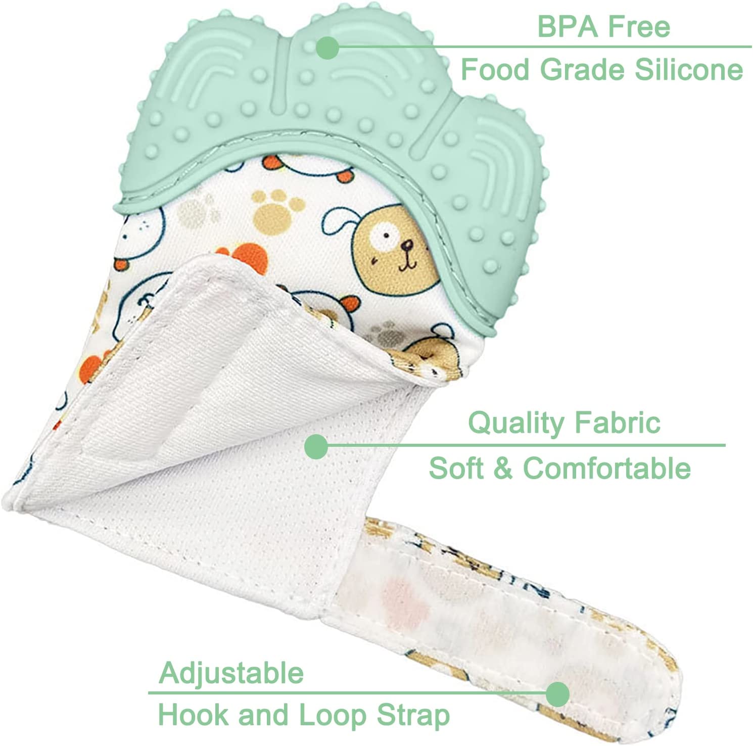 - Safe Material: teething mittens for babies made of food grade silicone, BPA free, it’s very soft and durable, the best material for baby teether; and soft breathable fabric that absorbs baby’s drool well.